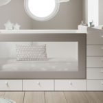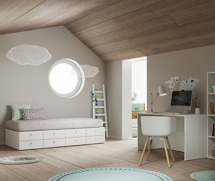 En el momento de realizar el cambio en la habitación, desmontamos la cajonera del cabezal para que la cama crezca e incorporamos unos prácticos cajones bajo la cama.