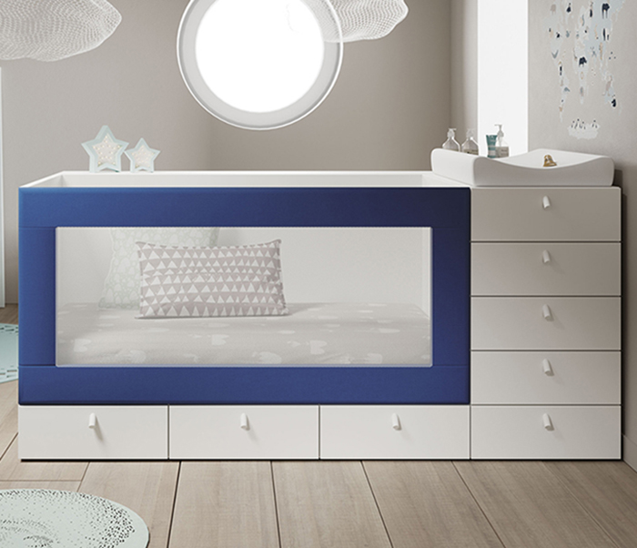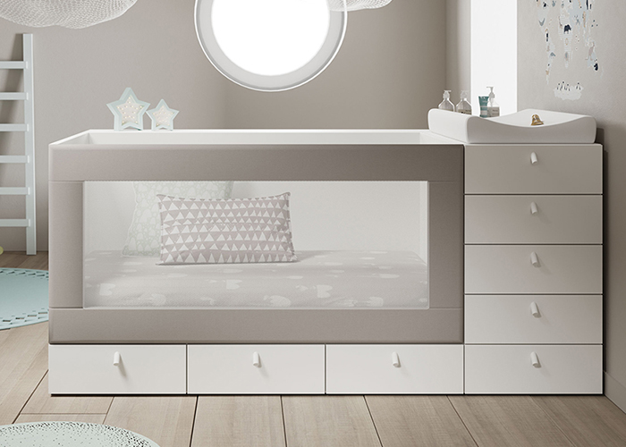 Hasta los 2 años el bebé dormirá en una confortable cuna. La cuna dispone de un práctico cambiador con cajones y de una barandilla que garantiza, en todo momento su seguridad.