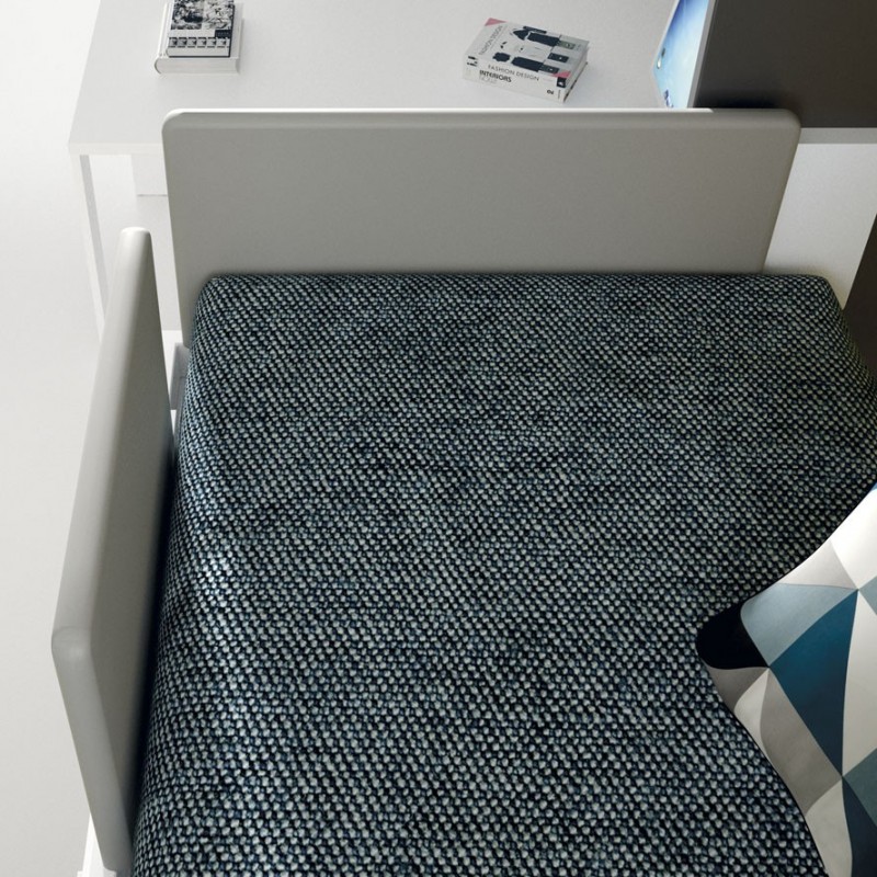 Las literas incorporan quitamiedos  plegables que podemos abrir para proteger a los niñ@s de posibles  caídas. Con los sistemas de seguridad abiertos en la litera superior  los niñ@s quedan totalmente seguros mientras duermen plácidamente. Los protectores están tapizados con una tela agradable y suave.